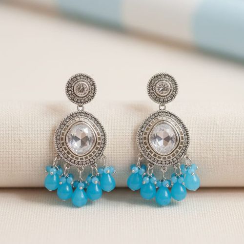283 Kundan-style Jhumka earrings with blue beaded drops.