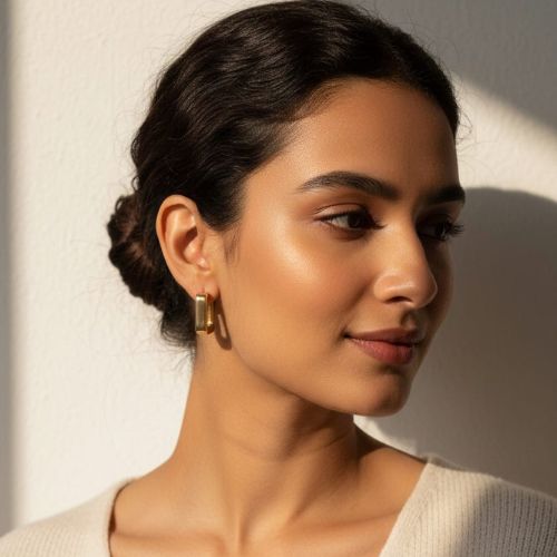 Make a bold style statement with these modern square-shaped gold hoop earrings. Featuring a sleek, geometric design, these earrings offer a contemporary twist on the classic hoop. The polished gold finish adds a touch of luxury and warmth, while the clean square shape brings a fresh, edgy vibe to your look. Lightweight and comfortable, they’re perfect for all-day wear—whether you’re heading to the office, a casual outing, or a special event. Versatile and eye-catching, these earrings pair effortlessly with both modern and traditional outfits. A must-have for any fashion-forward jewellery collection, they add instant sophistication and flair.