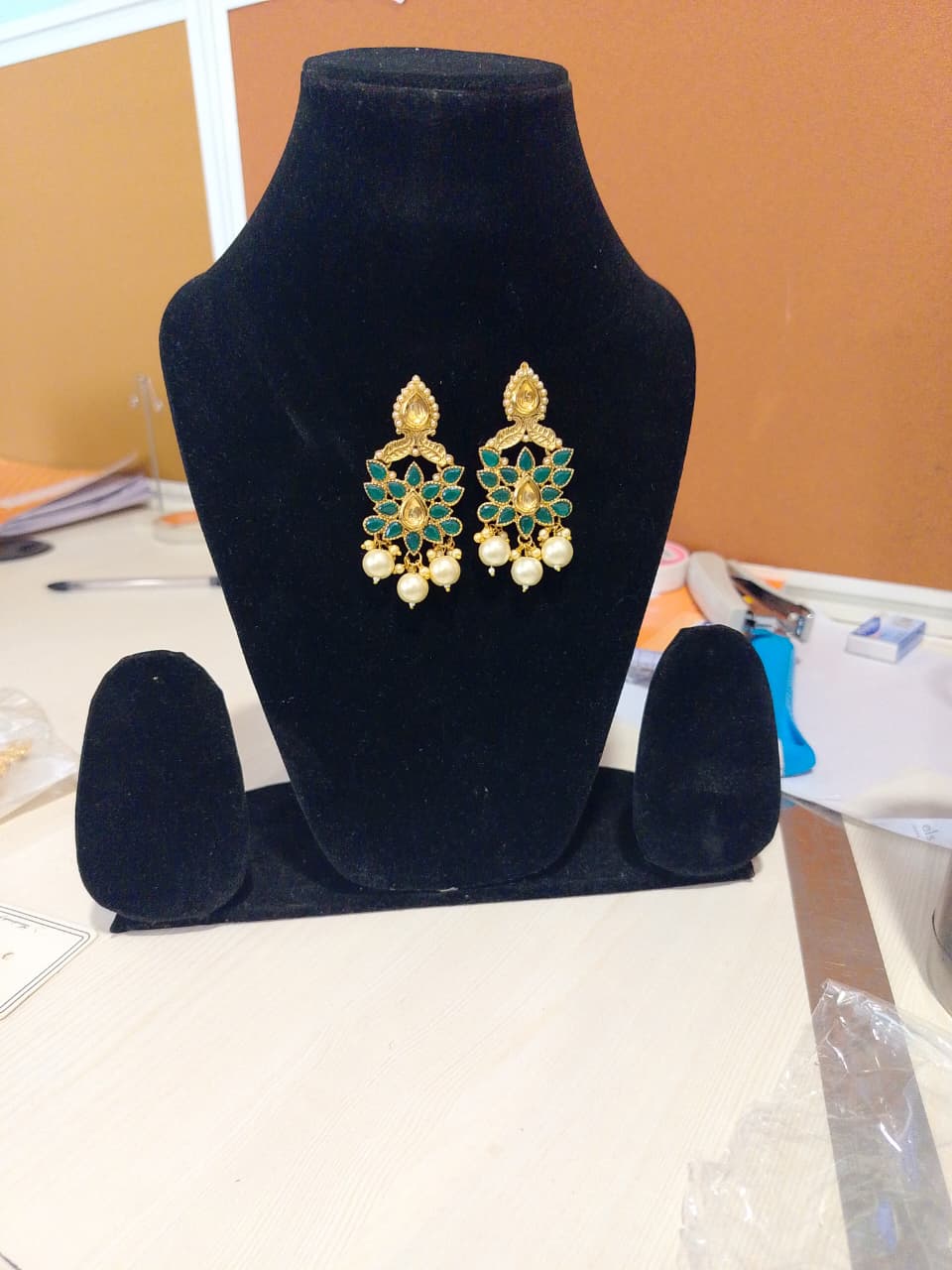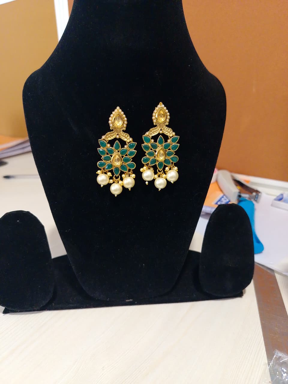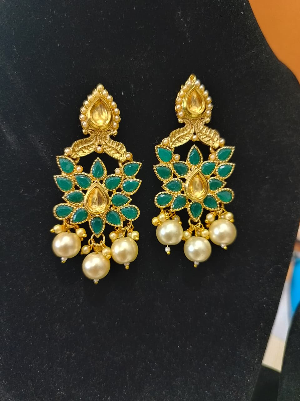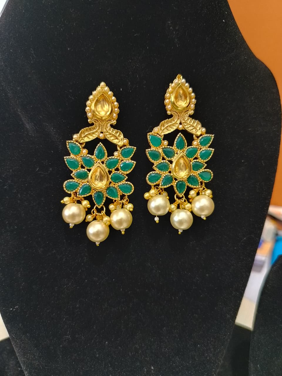 Add a touch of luxury to your ensemble with these exquisite Moissanite Polki Earrings adorned with vibrant green stones. Set in a refined gold-plated base, the earrings feature dazzling moissanite polki that mimic the brilliance of real diamonds, enhanced by the rich contrast of deep green accents. The intricate craftsmanship and elegant design make them a perfect choice for weddings, festive occasions, or evening soirees. Lightweight yet eye-catching, these earrings offer timeless appeal with a modern twist. Whether paired with traditional attire or contemporary outfits, this set is a radiant statement piece that reflects grace, style, and fine artistry.