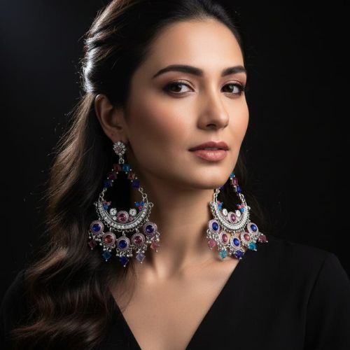 Add a splash of vibrant elegance to your jewelry collection with these stunning multi-colored oxidized Chandbali earrings. Expertly crafted with intricate detailing, these earrings blend traditional design with a modern twist through vivid hues and antique silver finish. The classic Chandbali shape, enhanced with colorful beads and fine craftsmanship, makes them a perfect accessory for festive occasions, weddings, or cultural events. Lightweight yet eye-catching, they offer comfort without compromising on style. Pair them with ethnic outfits like sarees, lehengas, or Anarkalis to elevate your look. These earrings are a beautiful celebration of color, culture, and timeless charm—all in one elegant piece.