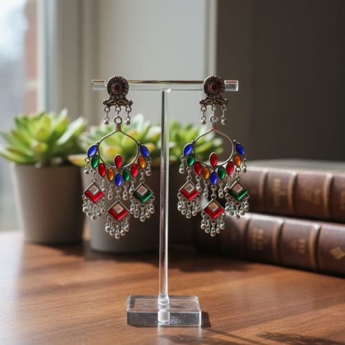 Add a vibrant flair to your ethnic style with these stunning Multicolored Mirror Oxidised Jhumka Earrings. Crafted in antique-finish oxidised silver, these earrings feature intricate detailing and are embellished with colorful mirror work that reflects light beautifully with every movement. The classic jhumka silhouette brings traditional elegance, while the multicolored accents add a playful, festive touch. Lightweight and comfortable for all-day wear, they are perfect for weddings, festivals, and cultural events. Pair them with sarees, kurtis, or fusion outfits for a bold yet graceful look. A must-have accessory that blends timeless design with a pop of color and sparkle.
