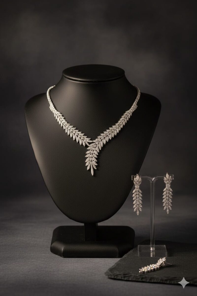 The Mystic Leaf AD Necklace Set is a stunning fusion of elegance and nature-inspired design. Crafted with precision, this set features delicate leaf motifs adorned with shimmering American Diamonds (AD) that reflect light beautifully, creating a captivating sparkle. The intricate detailing adds a touch of sophistication, making it perfect for both festive occasions and evening events. Paired with matching earrings, the set offers a balanced and graceful look that complements ethnic and contemporary outfits alike. Lightweight and stylish, the Mystic Leaf AD Necklace Set is a timeless accessory that brings charm, grace, and a hint of nature’s beauty to your collection.