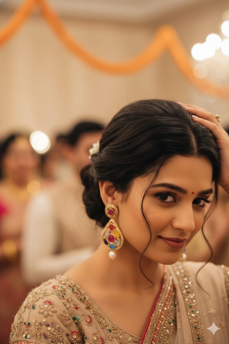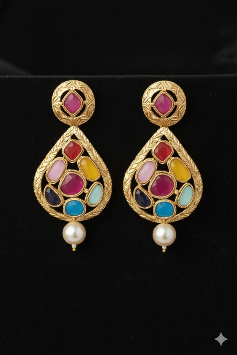 Navratan earrings are a vibrant and meaningful piece of traditional Indian jewelry, designed with nine distinct gemstones—ruby, pearl, red coral, emerald, yellow sapphire, diamond, blue sapphire, hessonite, and cat’s eye—each representing a celestial body in Vedic astrology. Set in beautifully crafted gold or gold-toned settings, these earrings are not only visually striking but also believed to bring balance, positivity, and good fortune to the wearer. Their colorful, symmetrical arrangement creates a captivating aesthetic, making them ideal for festive occasions, weddings, or cultural celebrations. Navratan earrings blend spiritual significance with timeless elegance, making them a cherished addition to any collection.