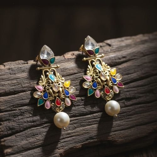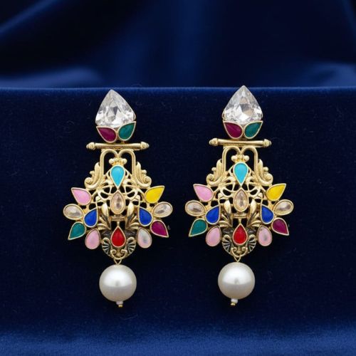 Navratan earrings are a vibrant and auspicious symbol of traditional Indian jewelry, featuring nine precious and semi-precious gemstones—ruby, pearl, red coral, emerald, yellow sapphire, diamond, blue sapphire, hessonite, and cat’s eye—each representing a celestial body. Set in intricately crafted gold or gold-plated designs, these earrings are believed to bring balance, prosperity, and positive energy to the wearer. Their rich colors and spiritual significance make them a perfect blend of beauty and meaning. Ideal for festive occasions, weddings, or cultural events, Navratan earrings add a touch of elegance, tradition, and colorful charm to any ethnic or fusion outfit.