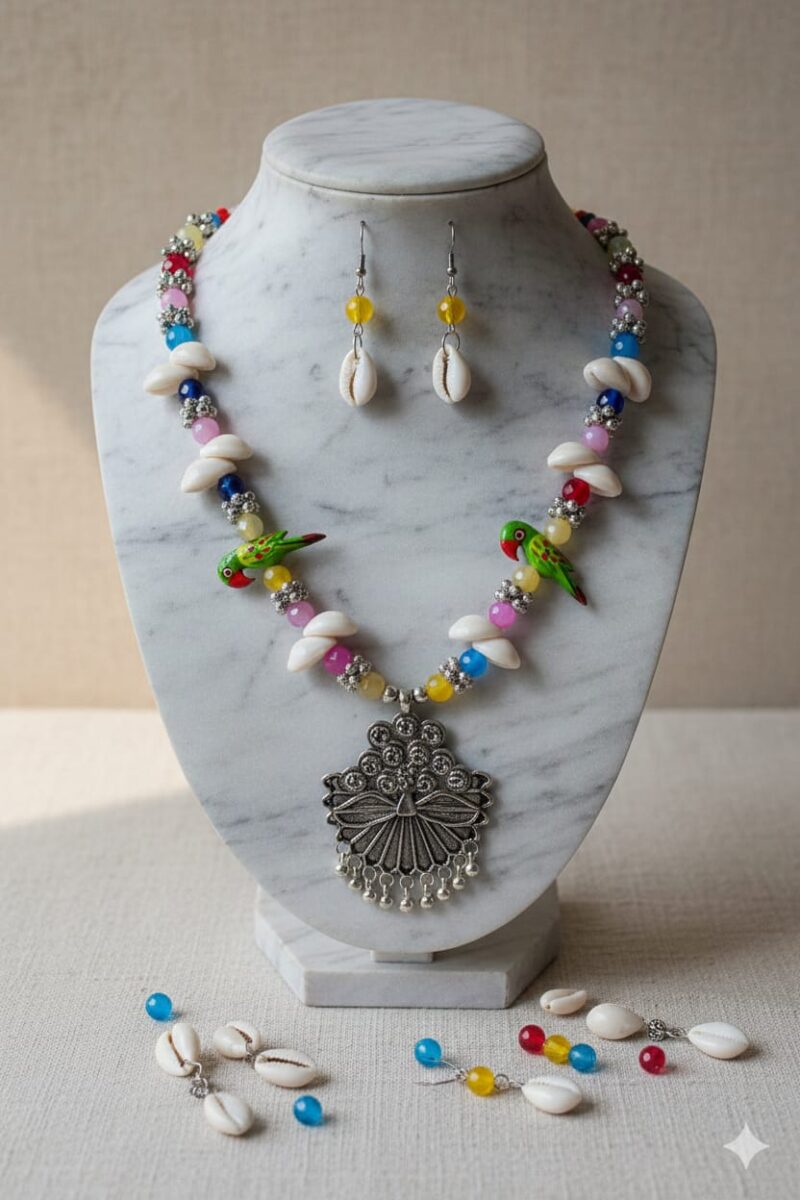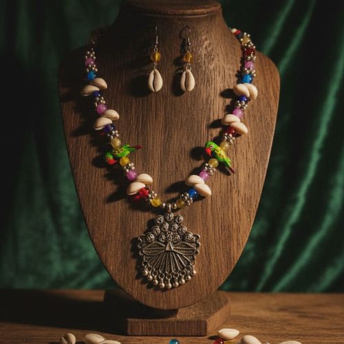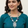 Celebrate the festive spirit of Navratri with this vibrant Traditional Necklace & Earrings Set, specially designed to complement your ethnic attire. Featuring intricate detailing, colorful beads, and traditional motifs, the set perfectly captures the energy and joy of the season. The necklace sits beautifully around the neck, while the matching earrings add a touch of elegance and charm. Lightweight and comfortable, it’s ideal for dancing through Garba nights, Dandiya events, or festive gatherings. Pair it with your chaniya choli or saree to complete your Navratri look. This set is a must-have accessory to embrace culture, color, and celebration in style.