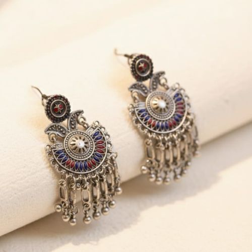 Add a vibrant splash of color to your look with the Ox 20 Multi Meena Oxidized Earrings, a stunning fusion of traditional design and colorful artistry. These earrings feature intricate oxidised silver craftsmanship adorned with beautiful Meena work in multiple shades, reflecting rich cultural heritage and skilled detailing. The elegant design adds a festive charm, making them perfect for weddings, celebrations, or ethnic daywear. Lightweight and comfortable, they pair effortlessly with sarees, kurtis, and lehengas. The Ox 20 Multi Meena Oxidized Earrings are a must-have for those who love bold, artistic jewelry with a touch of timeless elegance.