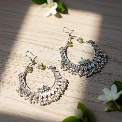 Embrace traditional elegance with these stunning Oxidised Chandbali Jhumka Earrings, a perfect fusion of classic design and vintage charm. Featuring a crescent-shaped Chandbali top with intricate patterns and a beautifully detailed jhumka drop, these earrings are crafted in high-quality oxidised silver for a timeless, antique look. The detailed craftsmanship reflects cultural richness, making them ideal for festivals, weddings, and special occasions. Lightweight yet striking, they sway gracefully with every movement, adding charm and sophistication to any ethnic outfit. Pair them with sarees, lehengas, or kurtis to complete your look with grace. A must-have for every traditional jewelry lover.