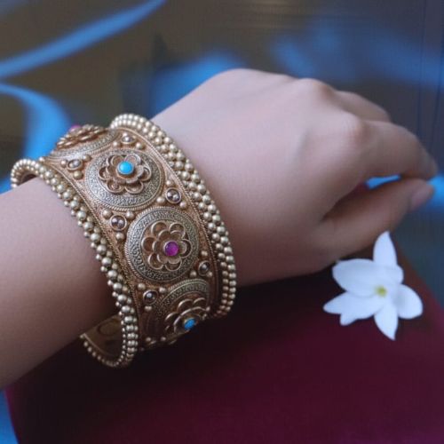 Add a regal touch to your accessories with the S Oxidised Golden Bracelet, a beautiful fusion of antique charm and contemporary elegance. Crafted from high-quality materials, this bracelet features intricate patterns and a rich oxidised golden finish that exudes a vintage royal appeal. Lightweight and comfortable, it is perfect for all-day wear and pairs effortlessly with both ethnic and fusion outfits. Ideal for festive occasions, weddings, or everyday styling, this bracelet enhances your look with subtle sophistication. The S Oxidised Golden Bracelet is a timeless piece that brings tradition and modern style together in one stunning accessory.