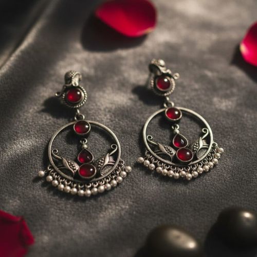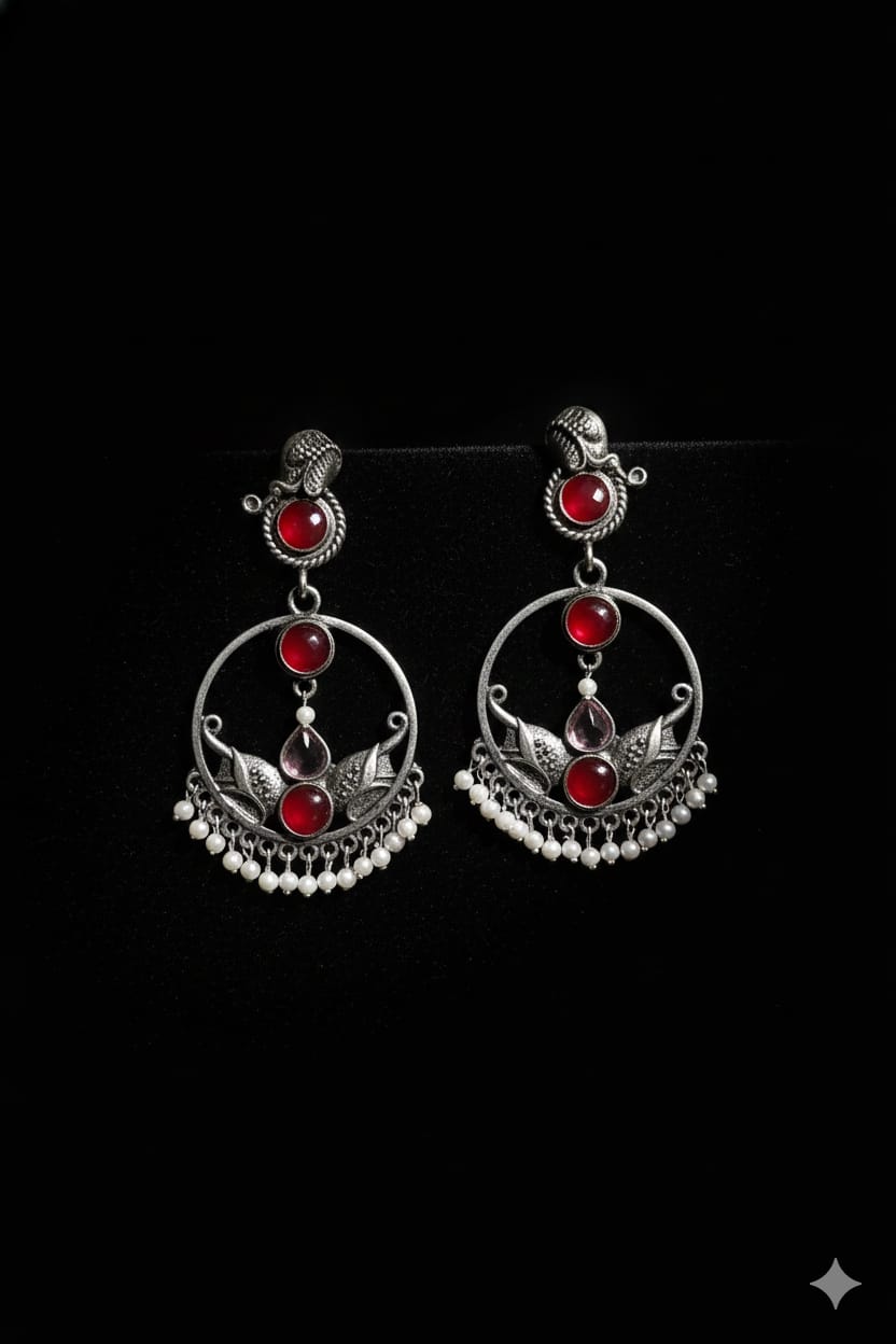 Make a regal statement with these stunning Oxidised Silver Chandbali Earrings, adorned with striking red stones and delicate pearl drops. Inspired by traditional Indian design, these earrings feature intricate craftsmanship in an elegant crescent shape, enhanced by the bold contrast of oxidised silver and vibrant red accents. The graceful pearl drops add a touch of softness and sophistication, making them perfect for festive occasions, weddings, or cultural celebrations. Lightweight and skin-friendly, they offer both comfort and style. Pair them with ethnic wear to complete your look with a blend of heritage charm and contemporary flair. A must-have in every collection.