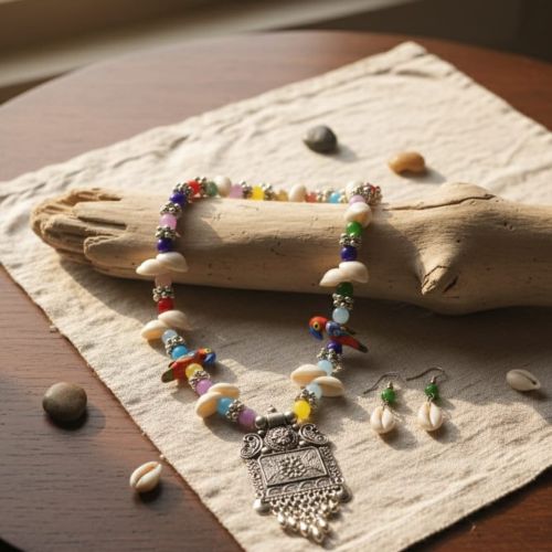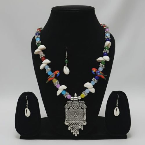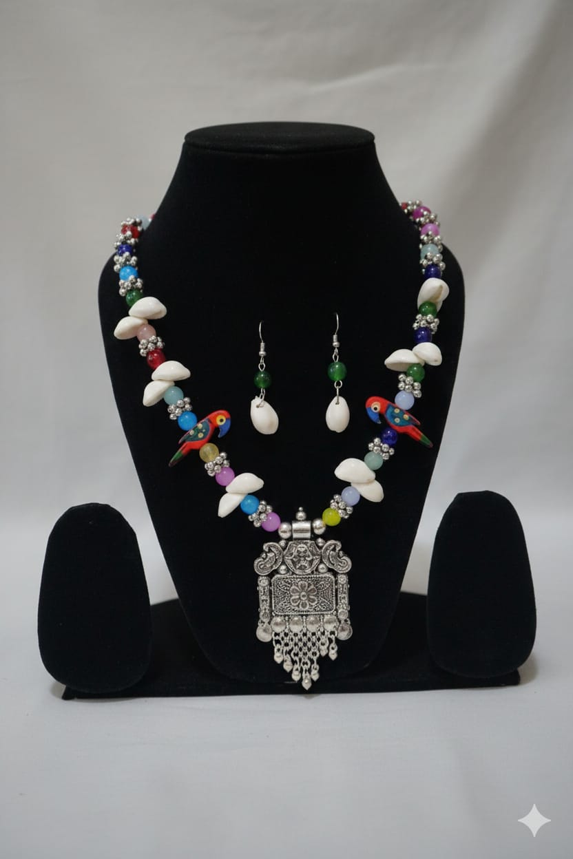 370 Oxidised Silver & Shell Necklace Set with Hand-Painted Parrot Motifs