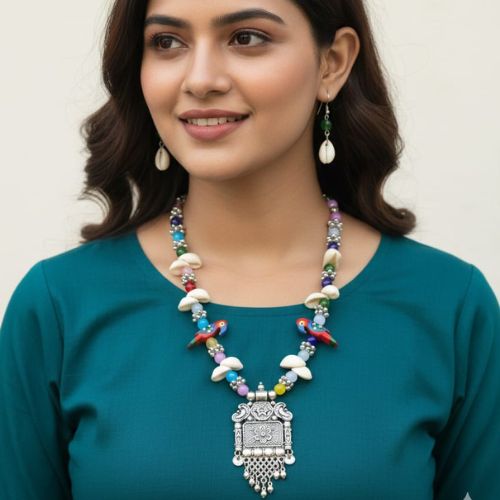 Add a touch of artistic elegance to your collection with this Oxidised Silver & Shell Necklace Set featuring exquisite hand-painted parrot motifs. Crafted with intricate detailing, the necklace blends rustic oxidised silver elements with natural shell accents, creating a unique fusion of tradition and creativity. The vibrant hand-painted parrots add a splash of color and charm, making the set truly one-of-a-kind. Paired with matching earrings, this lightweight and comfortable set is perfect for cultural events, festive occasions, or statement everyday wear. Celebrate craftsmanship and heritage with this beautifully designed necklace set that brings nature, art, and tradition together in perfect harmony.