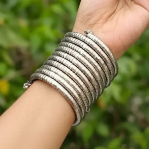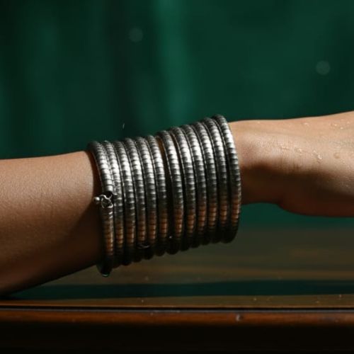 Elevate your accessory game with the Oxidised Spiral Bangle Bracelet, a stunning piece that blends traditional craftsmanship with contemporary design. Featuring a unique spiral pattern, this bracelet is crafted from oxidised metal to give it a vintage, antique look that adds depth and character to any outfit. Lightweight yet durable, it offers comfortable wear throughout the day, making it perfect for both casual and festive occasions. Its versatile design pairs beautifully with ethnic wear like sarees and kurtis, as well as modern outfits. Add a touch of timeless elegance and artistic flair to your jewelry collection with this beautifully crafted oxidised spiral bangle.