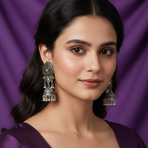 Enhance your traditional wardrobe with these elegant Oxidised Style Jhumka Earrings. Crafted with intricate detailing in high-quality oxidised silver, these earrings embody timeless ethnic charm. The classic jhumka shape, combined with antique finish and delicate patterns, makes them perfect for festivals, weddings, and cultural celebrations. Lightweight and comfortable, they add graceful movement and sophistication to any outfit. Whether paired with sarees, lehengas, or kurtis, these oxidised jhumkas bring a vintage appeal and versatile style to your jewelry collection. A must-have accessory for those who appreciate traditional design with a contemporary twist.