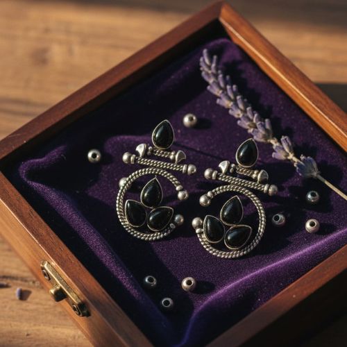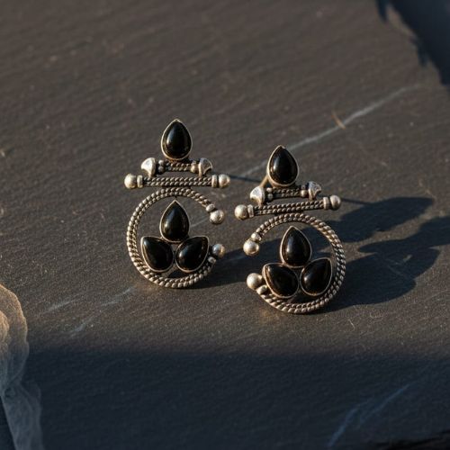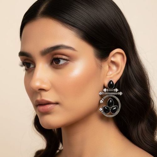 These oxidized silver earrings with black stones are an exquisite fusion of bohemian charm and traditional elegance. The darkened silver finish gives them an antique look, beautifully setting off the deep black stones that catch the light with subtle sparkle. Their detailed craftsmanship includes delicate filigree or textured metalwork, offering dimension and depth. Lightweight and comfortable, they sway gently with each movement, perfect for both festive occasions and everyday wear. Pair them with ethnic outfits or modern fusion styles to add a touch of edginess and grace. A versatile addition to any jewellery collection.