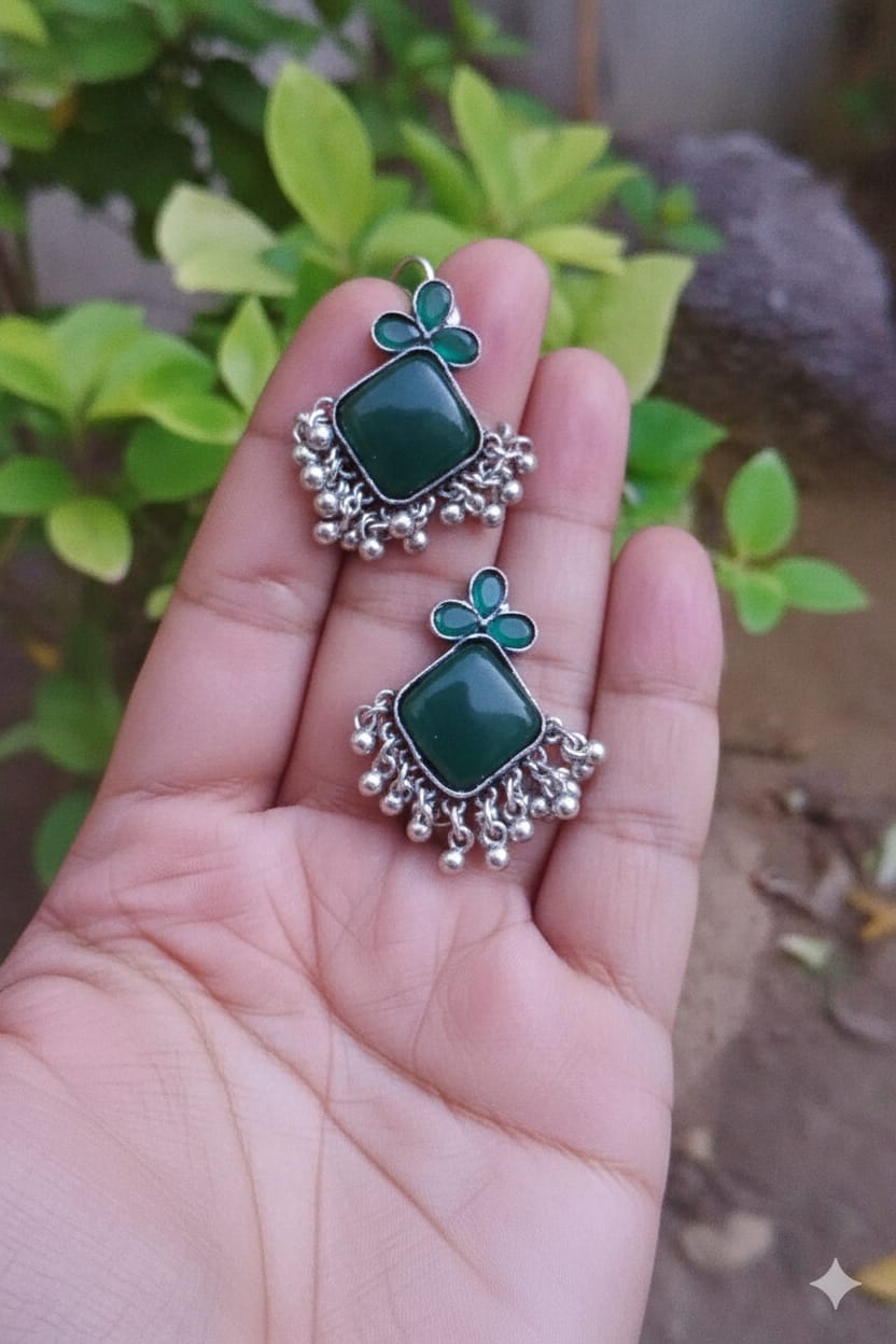 390 Oxidized Silver Jhumka Earrings with Green Stones,