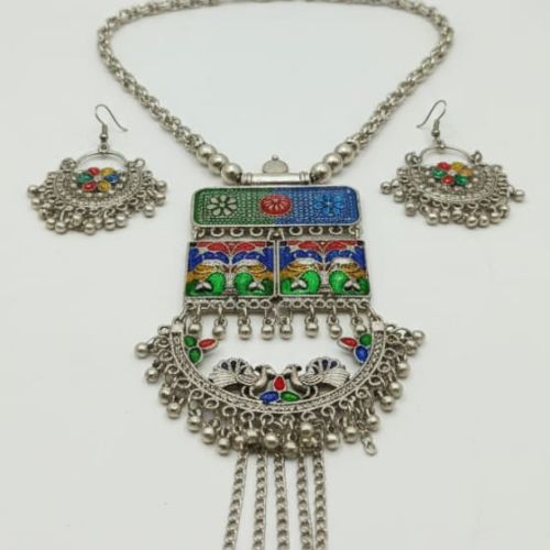 Elevate your ethnic elegance with this stunning Oxidized Silver Necklace Set with Pendant and Matching Earrings. Crafted with intricate detailing, the set features a beautifully designed pendant that exudes traditional charm, paired with matching earrings to complete the look. The oxidized silver finish lends a vintage, handcrafted appeal, making it perfect for festivals, weddings, and cultural events. Lightweight and comfortable, this versatile set pairs effortlessly with sarees, lehengas, and kurtis. Whether you’re dressing up for a special occasion or adding a touch of heritage to your everyday attire, this necklace set is a timeless addition to your jewelry collection.