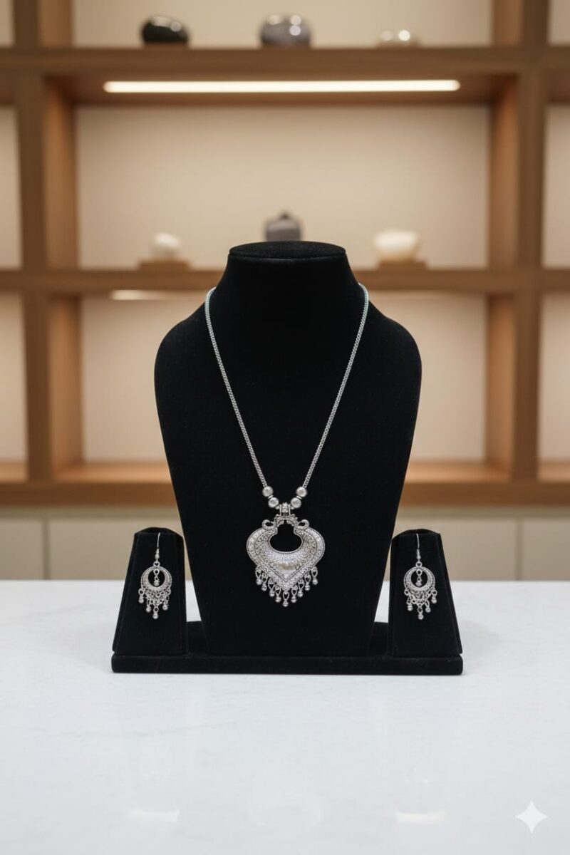 Make a bold statement with this exquisite Oxidized Silver-Plated Choker Necklace and Earring Set, designed to elevate your ethnic look. Crafted with intricate detailing and finished in antique oxidized silver plating, this set features a stunning choker necklace paired with matching earrings, blending traditional charm with contemporary style. Lightweight and comfortable, it’s perfect for weddings, festivals, and special occasions. The vintage finish adds timeless elegance, while the craftsmanship highlights intricate patterns that captivate attention. Pair this versatile set with sarees, lehengas, or fusion wear to add a regal touch and complete your festive ensemble effortlessly.