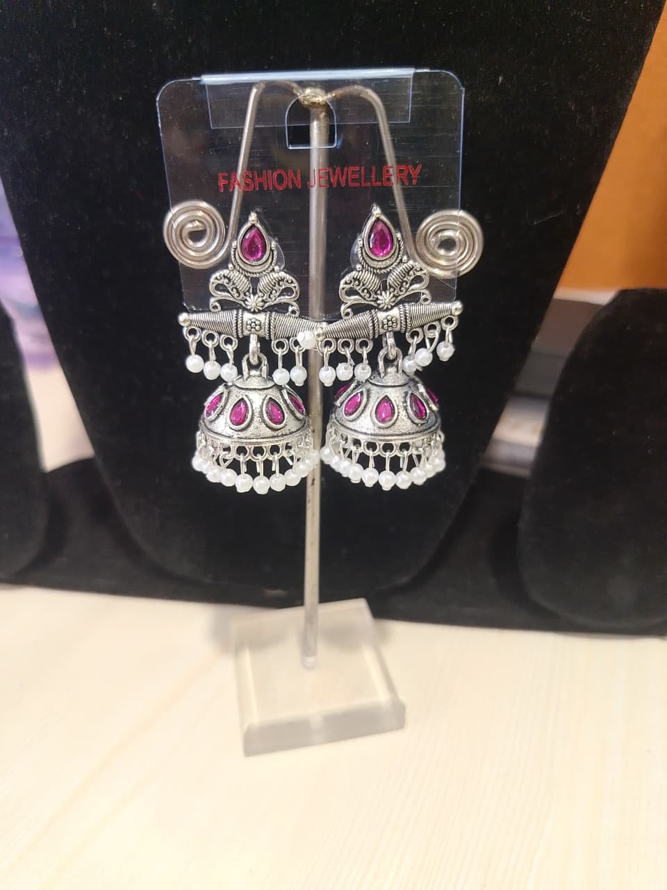 oxidized silver-plated fashion earrings with black stone and pearl drops