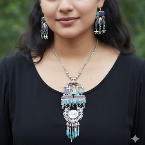 Step into tradition with the Palki New Oxidised Set, a stunning jewelry ensemble inspired by classic Indian motifs. Crafted with exquisite oxidised silver, this set features intricate detailing that captures the elegance of the iconic palki design. The set includes a beautifully crafted necklace and matching earrings, perfect for festive occasions, weddings, or ethnic celebrations. Lightweight yet striking, it adds a vintage charm to any outfit, effortlessly enhancing sarees, lehengas, and salwar suits. Embrace timeless artistry and cultural richness with this versatile oxidised set that blends heritage craftsmanship with modern style. A must-have for every ethnic jewelry lover
