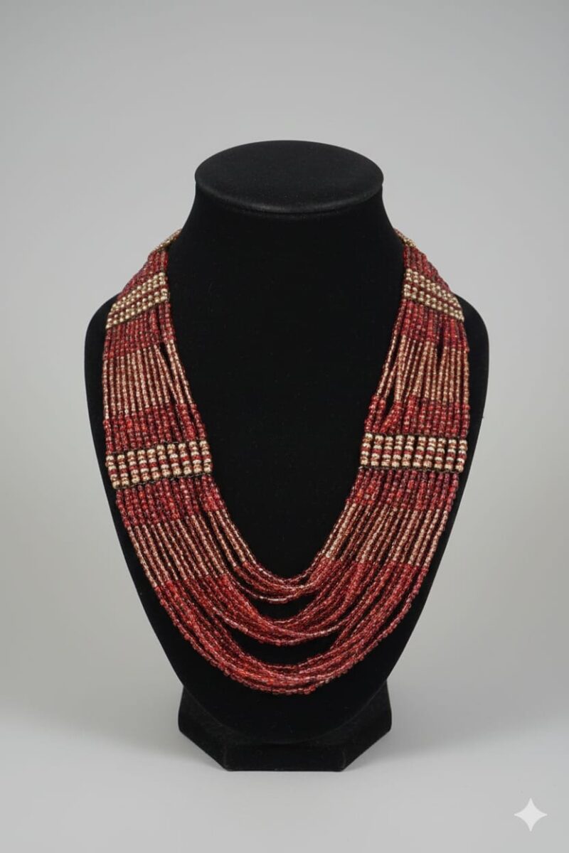 Celebrate tradition with elegance through this handcrafted Pote Mala, a timeless piece of Nepali jewelry. Made from numerous strands of vibrant glass beads, this necklace symbolizes cultural heritage, often worn during special occasions, festivals, and weddings. The rich color and intricate design reflect both beauty and significance, traditionally representing marital status and feminine grace. Lightweight yet striking, the Pote Mala sits gracefully around the neck, adding a bold, ethnic charm to any outfit. Whether paired with traditional attire or used to add a cultural touch to modern fashion, this necklace is a beautiful tribute to heritage and craftsmanship.