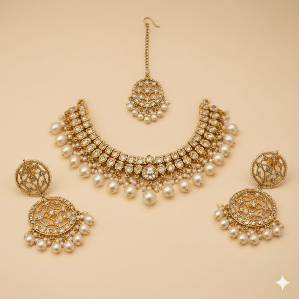Celebrate the vibrancy of North India with this Punjabi Traditional Jewellery Set, a stunning ensemble steeped in rich heritage and craftsmanship. The set features a bold, gold‑polished necklace with intricate motifs and delicate pearl or bead detailing, perfectly paired with matching earrings. Designed to complement classic Punjabi attire like salwar kameez, lehenga or sharara, this jewellery brings festive shimmer to wedding ceremonies, cultural performances and grand family gatherings. Lightweight yet eye‑catching, each piece balances ornate embellishment with comfort. Add this set to your collection for a timeless touch of regal Punjabi elegance.