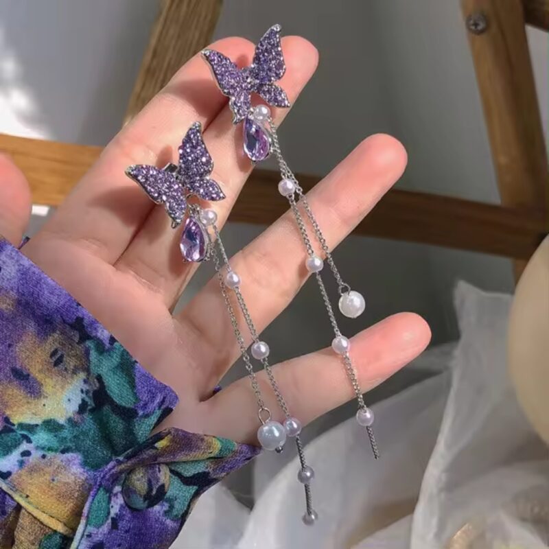 Add a magical touch to your look with these enchanting Purple Butterfly CZ/Rhinestone Pearl Tassel Dangle Earrings. Featuring delicate purple butterfly motifs adorned with sparkling cubic zirconia or rhinestones, these earrings blend whimsical charm with elegant sparkle. A cascading pearl tassel adds graceful movement and a touch of classic sophistication. Perfect for special occasions, romantic evenings, or elevating your everyday style, these earrings are lightweight, comfortable, and beautifully eye-catching. The dreamy combination of purple hues, shimmer, and pearls creates a feminine, fairy-tale aesthetic. A must-have accessory for those who love standout pieces with a blend of elegance and playful beauty.
