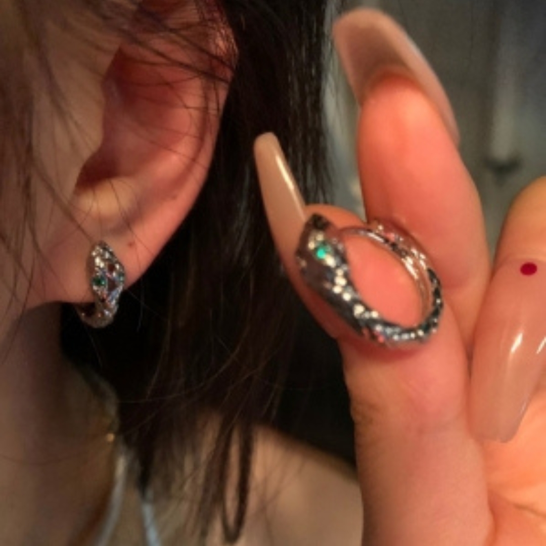 - Description: These earrings feature a snake design in a silver-toned metal, shaped into a huggie hoop style that fits closely around the earlobe. The snake’s eyes are accented with green stones, likely artificial stones or cubic zirconia, resembling emeralds.
