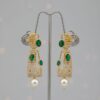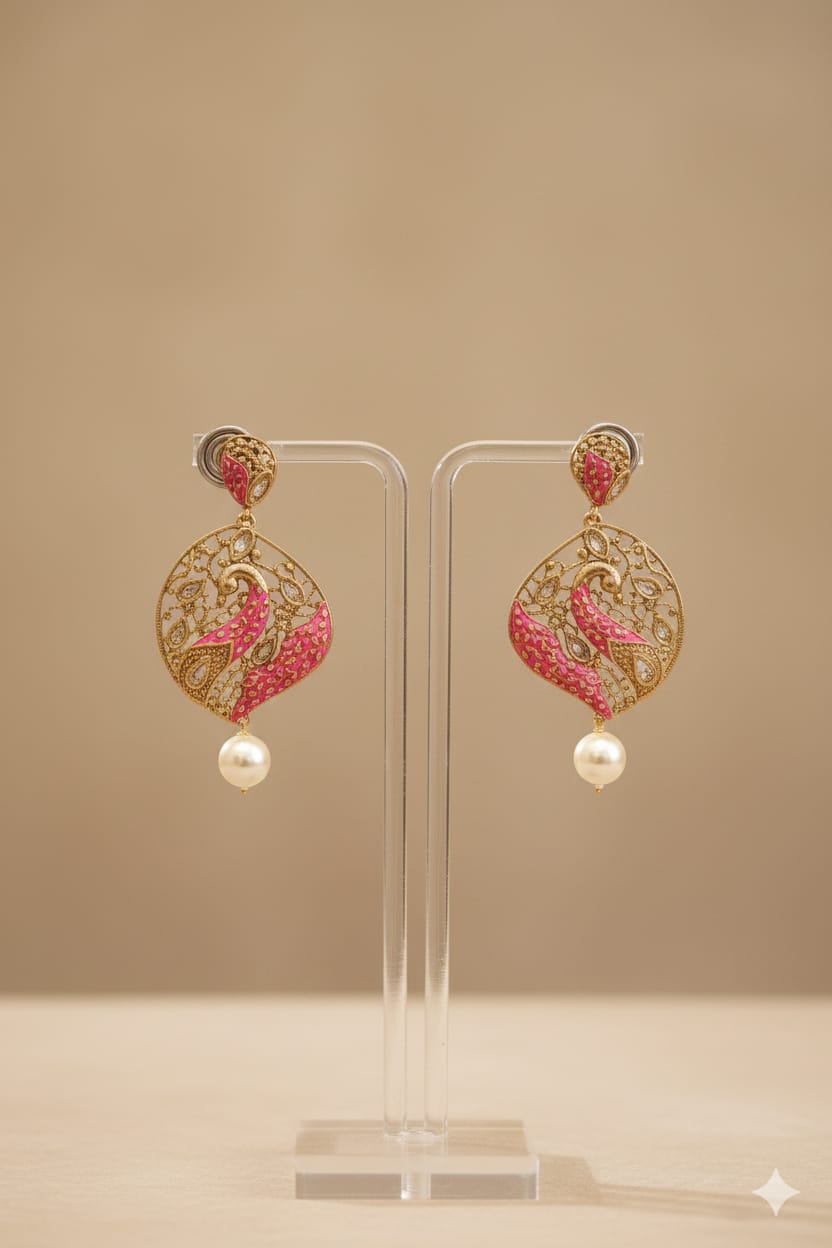 The earrings are gold-plated, meenakari earrings featuring a peacock design with kundan stones and a pearl drop.