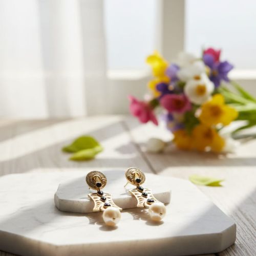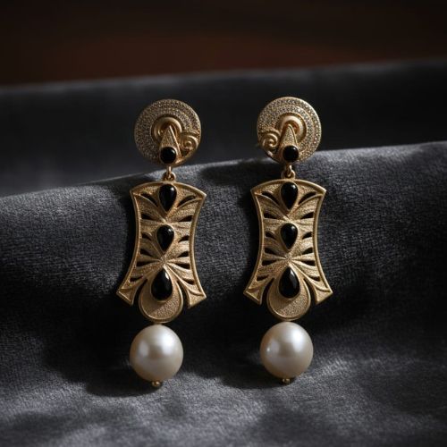 This is a pair of traditional Indian earrings featuring a radiant gold-toned finish, accented with striking black stones and an elegant pearl drop. The combination of rich gold and deep black creates a bold yet timeless look, while the pearl drop adds a touch of grace and sophistication. Designed with intricate detailing, these earrings reflect the charm of classic Indian craftsmanship. Perfect for festive occasions, weddings, or cultural events, they pair beautifully with ethnic attire like sarees or lehengas. Their unique color contrast and traditional style make them a standout addition to any jewelry collection, blending elegance with heritage effortlessly.