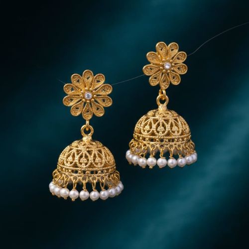 Traditional Jhumka Earrings with Pearls are a timeless piece of Indian jewelry, celebrated for their iconic bell-shaped design and elegant charm. Handcrafted with intricate detailing, these earrings feature delicate pearl accents that add a touch of grace and refinement. Rooted in cultural heritage, Jhumkas are often worn during weddings, festivals, and traditional ceremonies, making them a cherished accessory for special occasions. The combination of detailed metalwork and dangling pearls creates a beautiful movement and classic appeal. Whether paired with a saree or lehenga, these earrings bring a perfect blend of tradition, femininity, and sophistication to any ethnic ensemble.