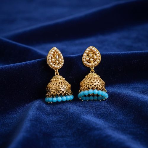 Victorian-style Jhumkas are a stunning fusion of classic Indian design and vintage European elegance. Inspired by the opulence of the Victorian era, these earrings feature intricate filigree work, antique gold or silver finishes, and are often embellished with sparkling stones, crystals, or pearls. The signature bell-shaped silhouette of traditional Jhumkas is retained, but with a regal twist that adds a touch of old-world charm. Perfect for weddings, evening parties, or festive occasions, Victorian-style Jhumkas blend sophistication with tradition. Their timeless appeal and artistic detailing make them a statement accessory for those who appreciate vintage-inspired, elegant ethnic jewelry.