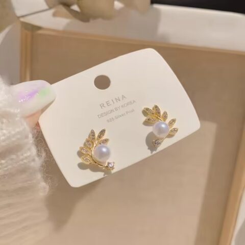 284 Leaf and Pearl Stud Earrings or Golden Pearl Leaf Stud Earrings with Rhinestones/Crystals.