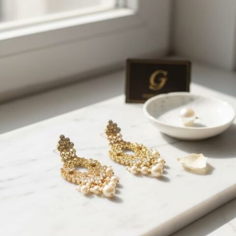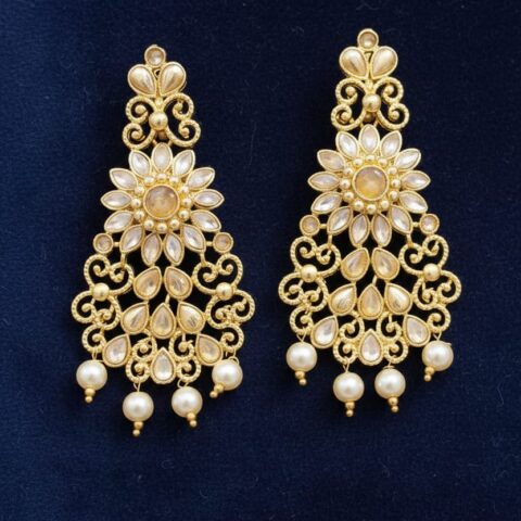 278 Kundan earrings with a matte gold finish and pearl accents,