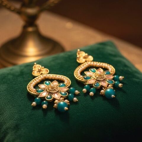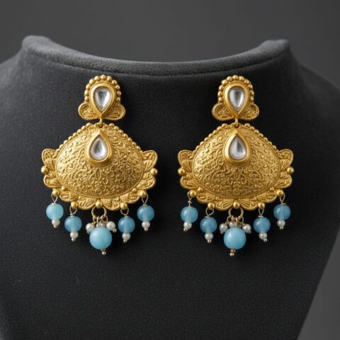 283 Kundan-style Jhumka earrings with blue beaded drops.
