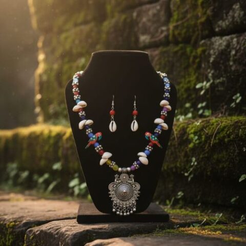 334 Navratri Special! Multicolor German Silver Shell & Thread Beads Necklace Set