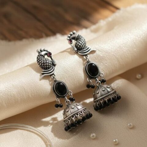 396 oxidized silver peacock jhumki earrings