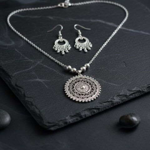 123German Silver Necklace Set with a Round Pendant and Ghunghru Beads.