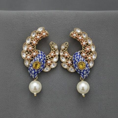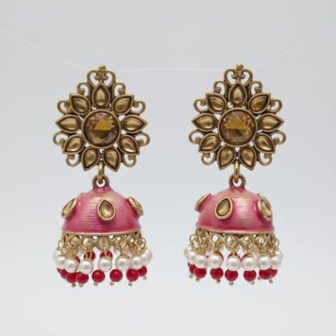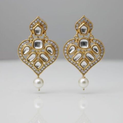 460 The earrings shown in the image are a style of traditional Indian jewelry known as Kundan or Polki earrings, often featuring a design with a pearl drop