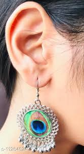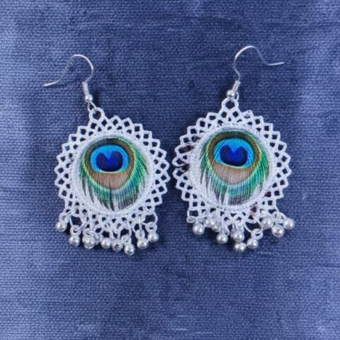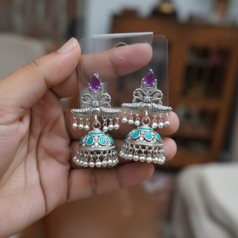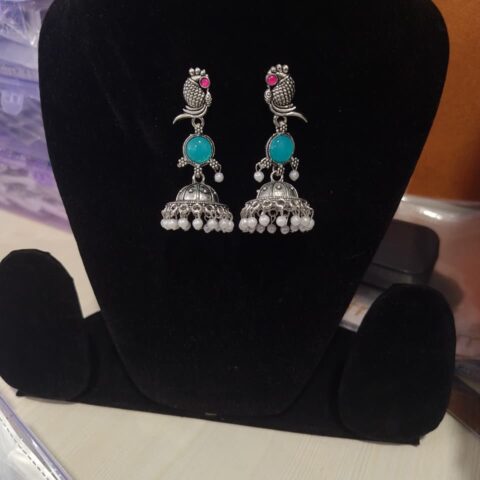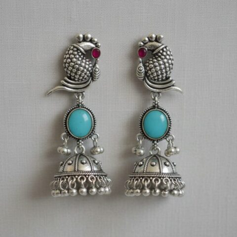 oxidized silver peacock jhumka earrings with turquoise stones and white pearl embellishments.