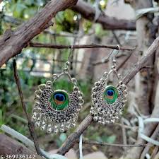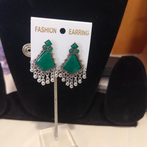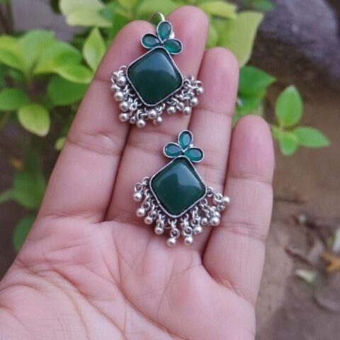 Oxidized Silver Jhumka Earrings with Green Stones,