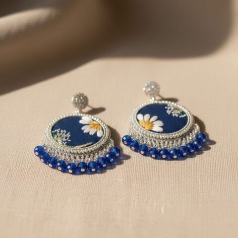 oxidized silver jhumka earrings with blue enamel work and blue bead detailing,