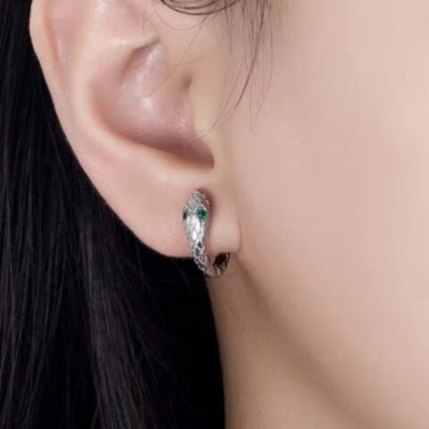 Silver-toned Snake Huggie Hoop Earrings with Green “Emerald” Eyes